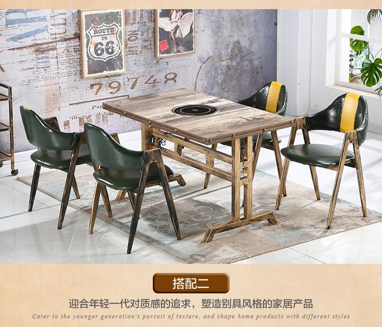 梦达隐形电磁炉火锅桌,原木与铁艺的结合,加上火锅元素更添新意。复古工业风,做旧造型彰显强悍个性。实木板、免漆板两种板材可选,火锅店可以根据自己的预算选择不同板材火锅桌。