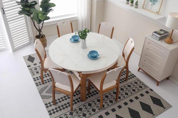 由橡胶木实木桌腿+E1级高密度板桌面+磨砂大理石纹理钢化玻璃组成。外观颜色以象牙白偏粉的暖色调结合原木色,温馨淡雅的北欧风给人清新靓丽的感觉,完全摒弃了北欧风的冷淡性。结合整体的空间搭配简约而大方,又不失现代的时尚感,即使小户型餐厅,2.5平米的小餐厅也足以容纳,白色和原木色搭配也有利于增加空间视觉效果,2.5平小餐厅便可容纳,用餐人数容纳在4-10人完全不拥挤。