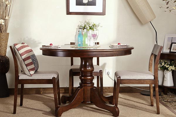餐桌有方的有圆的,根据不同人的不同喜好、性格,餐桌的选择也各有不同。比起严肃的方桌,西餐圆桌讲求的是和谐,没有上位与下位之分,餐桌上的人地位平等,气氛也会更加的融洽。这款纯实木的西餐圆桌,弧度流畅自然,打磨光滑,圆形的外表配合它温润的黑樱桃木材质,看上去更加的自然和谐,体现出大自然般的亲切感,相信在这款餐桌上用餐,人与人之间的感情也能够得到快速提升。